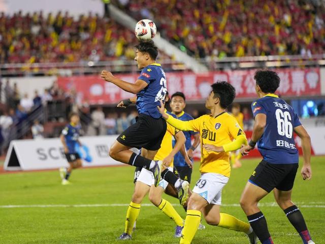 凉山队(蓝)球员头球争顶(徐湘东 摄)